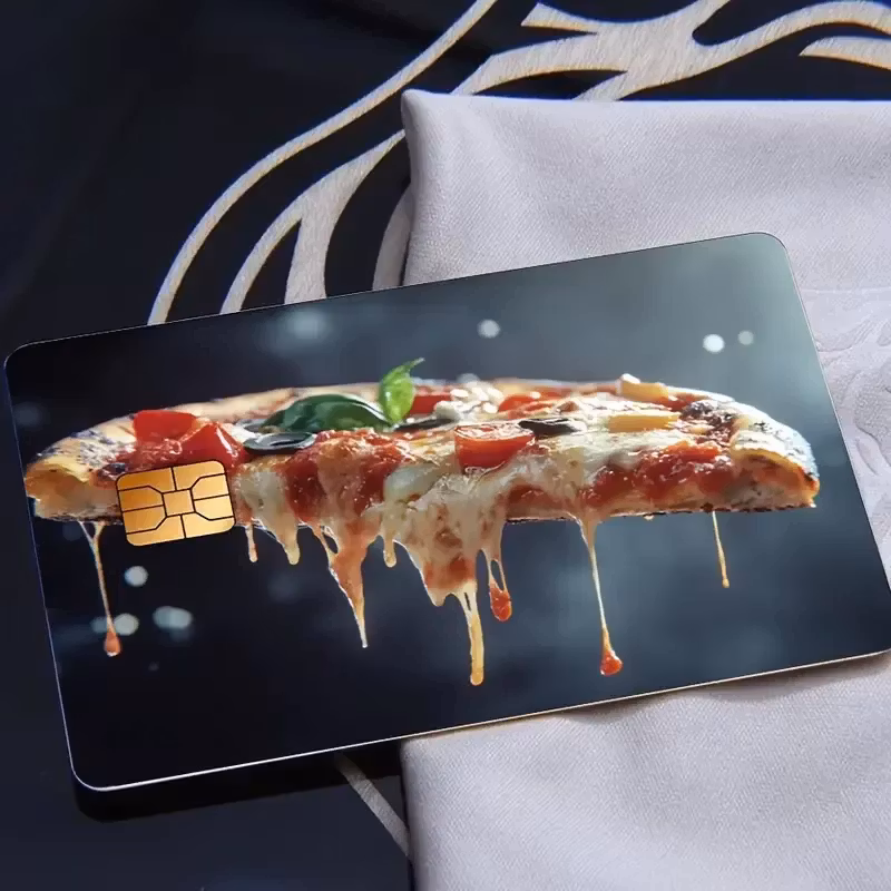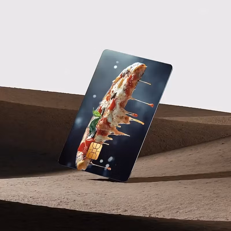 Skin föreställande en pizza. För kort utan präglade tecken på framsidan.